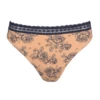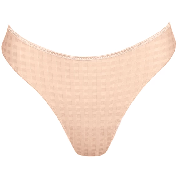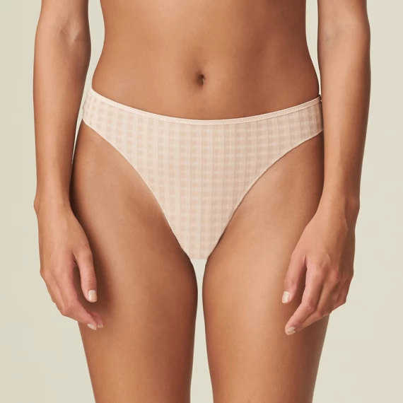Der Avero String von Marie Jo in der Farbe Caffe Latte. Dieser hellbeige String hat einen hohen Beinausschnitt, dadurch wirken die Beine optisch länger. Der String ist hinten mit einem Blümchen verziert