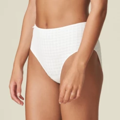 Der Avero Taillenslip von Marie Jo in der Farbe Natur. Dieser cremefarbene Slip ist ein schöner Kompromiss zwischen Eleganz und Tragekomfort.Dank des hohen Bündchens wird der Bauch bedeckt. Der Slip an der Seite mit einer Blume verziert.