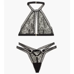Das Set Boîte à Désir ist in der Farbe Noir erhältlich. Dieser raffinierte BH und String sind aus verführerischer Spitze gefertigt. Das Set zeichnet sich durch verspielte Linien und sexy Stoffe aus, die sich auf der Rückseite des Sets fortsetzen. Das Dessous-Set ist mit goldfarbenen Ringen verziert und in der Größe verstellbar. Das Größensystem dieser sexy Serie ist „Einheitsgröße“. Die Boîte à Désir-Kollektion von Aubade ist ein Must-Have im Bereich der anspruchsvollen Lingerie!