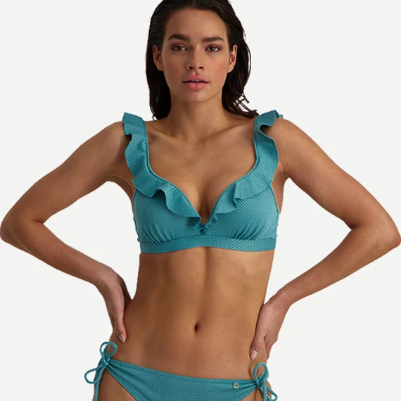 Das Bikinitop Brittany Blue von Beachlife ist in einer blauen Farbe gehalten. Der unsichtbare Bügel sorgt für einen sicheren Halt, so dass sich das Bikinioberteil auch für größere Körbchengrößen eignet. Die Rüschen verlaufen von den Schulterträgern über die Cups und sorgen für einen stilvollen Look. Die Schulterträger sind verstellbar. Dieses Modell ist für seine bequeme Passform bekannt und ist der Bestseller der Kollektion. Kombinieren Sie die Kollektion mit einem Bikiniunterteil aus der Serie Brittany Blue. Mit Stil und Eleganz in den Sommer!