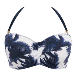 Das Carmelita Avenue Bandeau Bikinitop von Fantasy Bademode ist in der Farbe French Navy erhältlich. Das weiß-blaue Bikinitop hat einen tropischen Print mit Palmen. Das Oberteil verleiht dem Busen eine schöne runde Form und hat Träger, die im Nacken gebunden werden können. Die Schultergurte sind auf der Vorderseite mit einer goldenen Perle verziert. Das Bandeau Bikinitop hat abnehmbare Träger und kann daher auch trägerlos getragen werden. Kombinieren Sie dieses tropische Bikinitop mit einem der passenden Bikiniunterteile aus der Carmelita Avenue Kollektion.