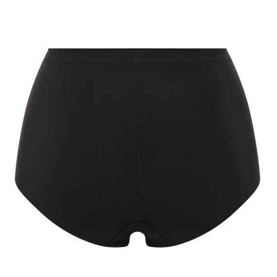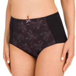 Der Chanson Taillenslip von Felina ist in der Farbe Schwarz erhältlich. Die Vorderseite dieses Slips hat schwarze, halbtransparente, florale Spitze auf einem hellrosa Hintergrund. Dieser Slip ist aufgrund der höheren Taille ideal, um einen möglichen Bauch zu kaschieren. Vorne ist der Slip mit einer rosa Schleife verziert. Kombinieren Sie diesen Slip mit einem der BHs aus der Chanson Serie.
