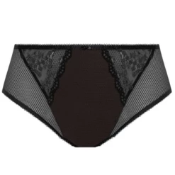 Der Charley Taillenslip von Elomi ist in der Farbe Black erhältlich. Dieser sinnliche, schwarze Slip enthält ein rautenförmiges Netzgewebe und ist an den Beinausschnitten mit einem kleinen Guipure-Spitzenrand versehen. Die etwas höhere Taille umschließt schön Ihren Bauch und die hohen Beinausschnitte lassen Ihre Beine optisch länger wirken. Die Seiten sind mit einer transparenten Blumenstickerei verziert. Dieser Slip ist sehr bequem, da die Beinausschnitte elastisch sind.