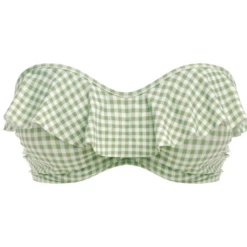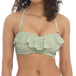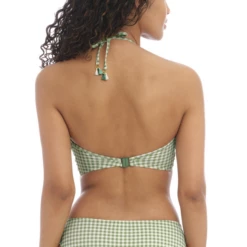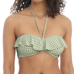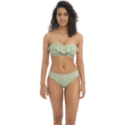 Das Check In Bandeau Bikinitop von Freya Bademode hat einen eleganten Khaki Print. Dieses Bikinitop hat einen Wasserfallrand, der für einen verspielten Touch sorgt! Das Top kann auf verschiedene Arten getragen werden, nämlich trägerlos, gerade und als Neckholder Modell.