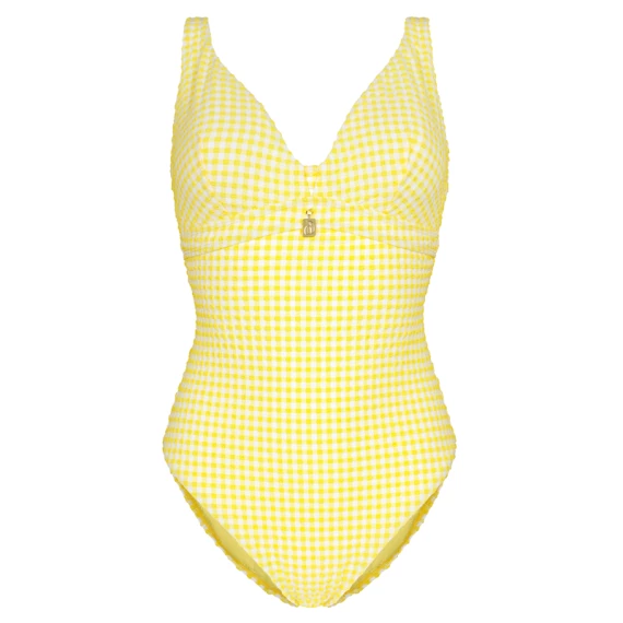 Der Checky Badeanzug von Annadiva Swim ist in der Farbe Citron gehalten. Dieser gelb-weiß karierte Badeanzug hat einen jungen und eleganten Look. Lieben Sie Vintage? Dann ist dieser Badeanzug ein Muss. Das plunge Modell schafft ein tiefes Dekolleté und die gepolsterten Cups geben Ihren Busen eine schöne runde Form. Der Badeanzug ist an den Beinen etwas höher geschnitten, was für eine gute Passform sorgt. Kombinieren Sie den Badeanzug mit einem der Accessoires. Cute & classy!