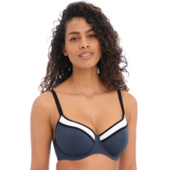 Das Colour Crush padded Bikini Oberteil von Freya Swimwear ist in der Farbe Ink gehalten. Dieses Bikini Oberteil hat eine dunkelblaue Farbe mit den Umrissen von schwarzen Paspeln, die sich verengen. Kombinieren Sie dieses Bikini-Oberteil mit einem der Oberteile aus der Colour Crush-Kollektion für einen dezenten, schicken Look.
