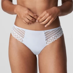 Der East End String von PrimaDonna Twist ist in der Farbe Heather Blue erhältlich. Dieser String ist aus einem glatten Stoff gefertigt und an den Beinen befindet sich geometrische Spitze.