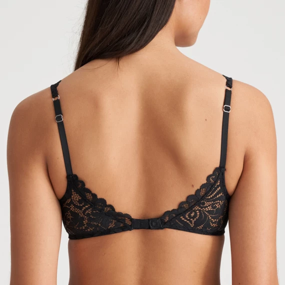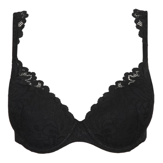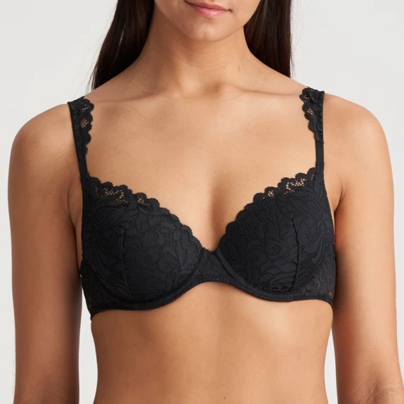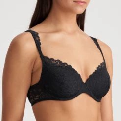 Der Herzform BH Elis von Marie Jo ist in der Farbe Schwarz erhältlich. Dieser vorgeformte, schwarze BH hat schöne Spitze an den Cups, die am Rücken herunterläuft. Die Schulterträger aus Spitze sind fast zu schön, um sie unter Ihrem Outfit zu verstecken. Da die Körbchen oben etwas abfallen, ist dieses Modell für fast jeden Busentyp geeignet, auch für die weniger vollen Busen.