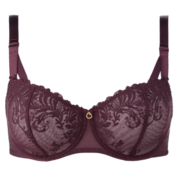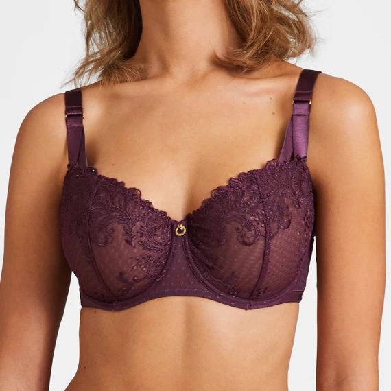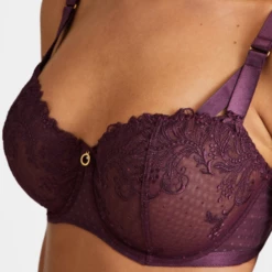 Der Femme Passion Half Cup BH von Aubade ist in der Farbe Wineberry erhältlich. Die Cups dieses schönen violette BHs sind mit einer luxuriösen Stickerei verziert. Unter der Stickerei ist ein Tüllstoff mit Polka-Dot-Druck verarbeitet, der sich in den Seitenteilen fortsetzt. Zwischen den Cups befindet sich ein Swarovski-Detail. Die Körbchen verleihen Ihren Busen eine schöne runde Form und sorgen für ein sexy offenes Dekolletee. Die breiteren Schulterträger bieten zusätzlichen Halt und Komfort.