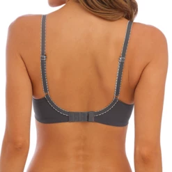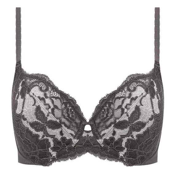 Der Bügel BH Florilege von Wacoal ist in der Farbe Inky Flower erhältlich. Dieser graue BH ist mit weißen Spitzendetails verziert. Zwischen den Spitzen wurde eine fortschrittliche japanische Webtechnik verwendet, die ein weiches Material und matte Details erzeugt. Der obere Teil des BHs ist leicht durchscheinend, so dass der Busen nicht vollständig bedeckt ist. Die nicht vorgeformten Körbchen verleihen dem Busen eine natürliche Form. Kombinieren Sie diesen BH mit einem der Florilege Slips.