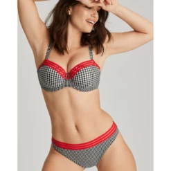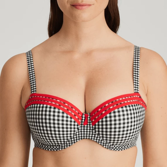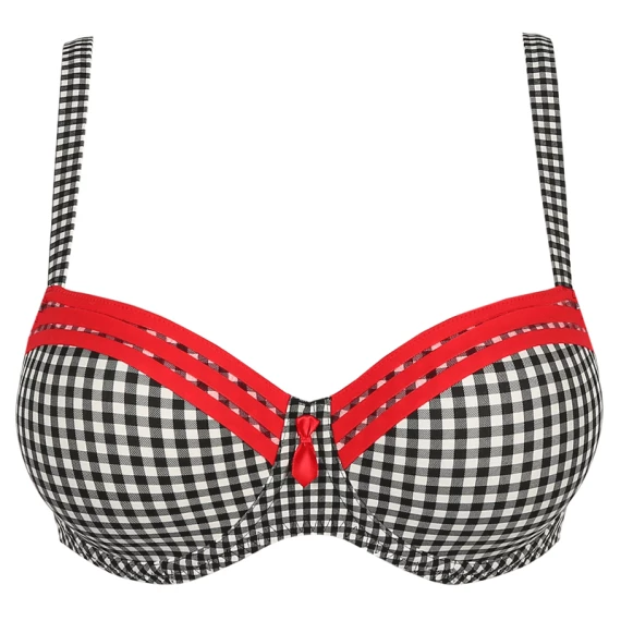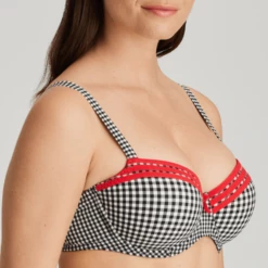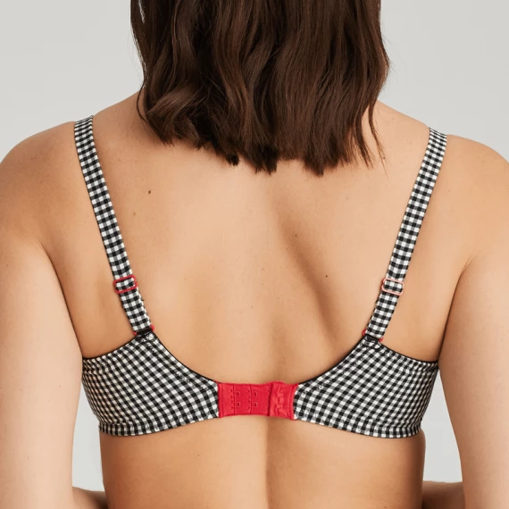 Der Gentlelady Vorgeformter Balconette-Bh von PrimaDonna Twist in der Farbe Black Check. Die Cups dieses schwarz-weiß karierten BHs sind an der Oberseite mit grafischen Linienspiel verziert. Zwischen den Cups ist ein kleines krawattenförmiges Detail befestigt. Die glatten Cups machen den Bh zum idealen T-Shirt Bh, da er nicht abzeichnet. Die stabilen Mousse-Körbchen dieses BHs bietet guten Halt und heben und zentrieren den Busen. Schwarzes Vichy-Karo und knallrote Paspeln: Eine himmlische Kombination!