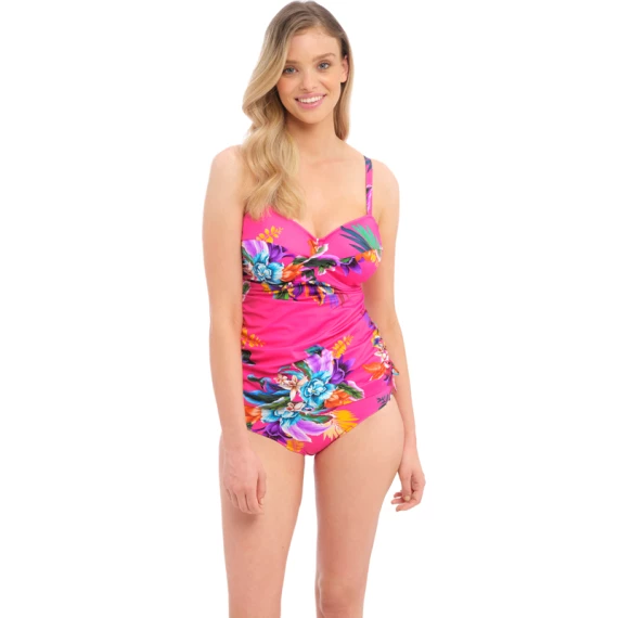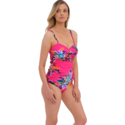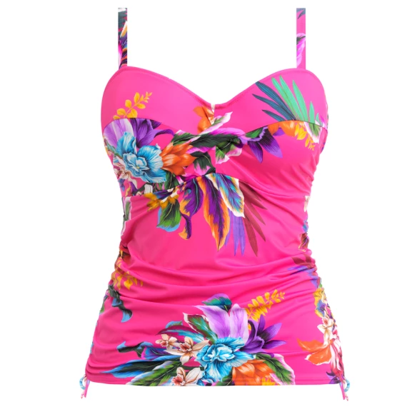 Das Halkidiki rosafarbenes Tankini Oberteil von Fantasie Bademode ist in der Farbe Orchid erhältlich.Dieses rosafarbene Tankini-Top hat ein buntes Blumenmuster in Himmelblau, Violett und Goldgelb. Dieses Oberteil hat einen schönen Twist auf der Vorderseite und eine gute Passform, die den Busen den nötigen Halt gibt. Das Tankini-Oberteil ist am Bauch gerafft, das schmeichelt der Figur.