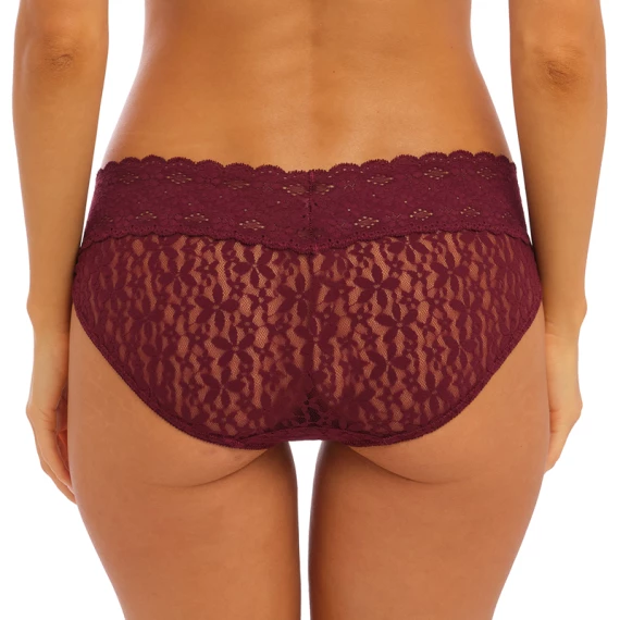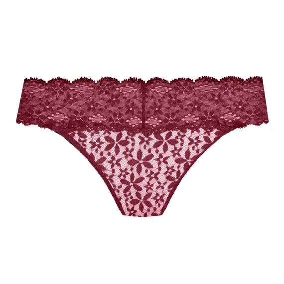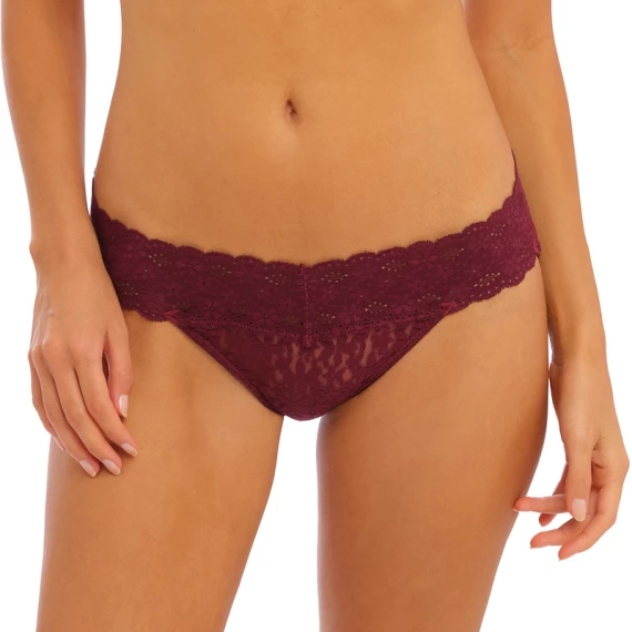 Der Halo Lace Slip von Wacoal ist in der Farbe Zinfandel gehalten. Dieser lilafarbene Slip ist mit schicker transparenter Spitze mit schönem Blumenmotiv verziert. Die Slips sind aus einem weichen Stretch-Stoff gefertigt und tragen sich daher wunderbar. Kombinieren Sie diese Slips mit einem der BHs aus der Serie!