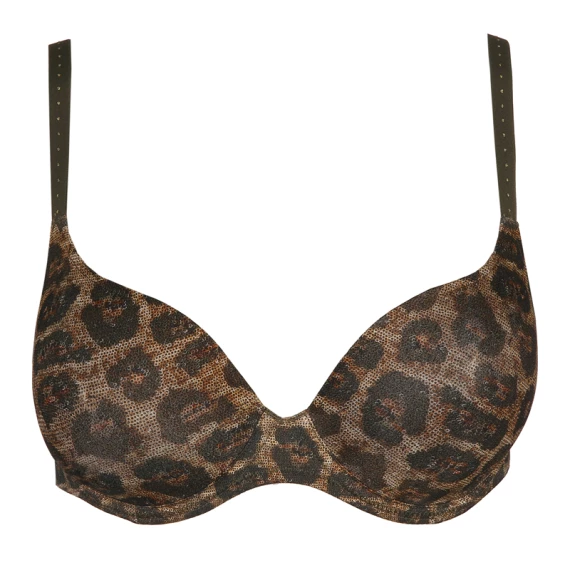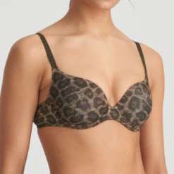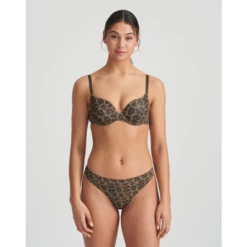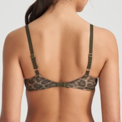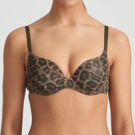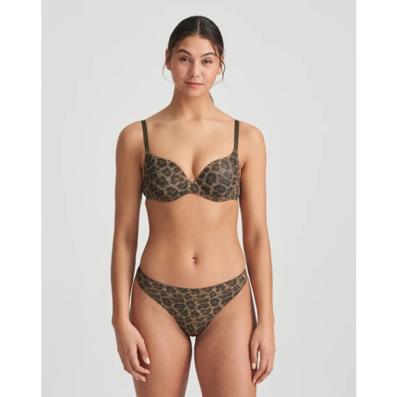 Der Herzform BH Hugh von Marie Jo ist in der Farbe Olive Green erhältlich. Dieser BH hat einen weichen Leopardenprint in schönen Erdtönen. Da die Körbchen oben etwas abfallen, ist dieses Modell für fast jeden Busentyp geeignet, auch für weniger volle Busen. Die Schulterträger sind mit kleinen goldenen Punkten verziert. Dank der glatten Cups kann dieser BH auch unter enger Kleidung getragen werden. Die verspielte Kombination aus Leopardenprint und einer modischen Farbe macht diese Serie zu einem echten Trend für den Herbst!