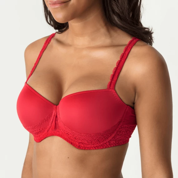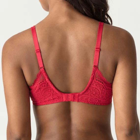 Der vorgeformte Balconette BH von PrimaDonna Twist ist in der Farbe Scarlet erhältlich. Dieser rote, elegante BH besteht aus einem glänzenden Satinstoff. An der Unterseite der Cups ist ein Spitzenmuster drapiert, das an den Seiten und auf der Rückseite des BHs verläuft. Zwischen den Cups ist ein verspieltes Detail angebracht, um den Look zu vervollständigen.