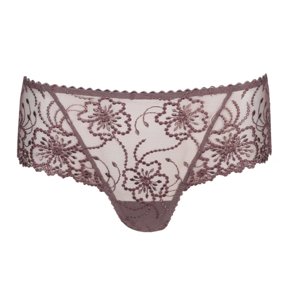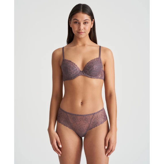 Der Jane Luxus String von Marie Jo in der Farbe Candle Night ist mit der gleichen Spitze versehen wie die passenden Jane BHs. Dieser String hat ein breites Band und lässt den unteren Teil des Gesäßes unbedeckt und wird zwischen Hüfte und Taille getragen. Der String wirkt besonders sinnlich, da er komplett aus Spitze gefertigt ist.