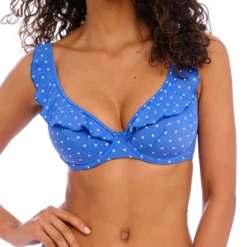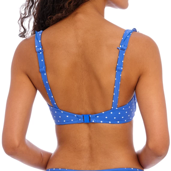 Das Jewel Cove Bügel Bikinioberteil von Freya Bademode in der Farbe Azure. Dieses blaue Bikinitop hat ein trendy Rautenmuster und einen verspielten Rüschenrand. Die Körbchen sind tief ausgeschnitten und heben den Busen subtil an. Ideal für ein tolles Decollete! Kombinieren Sie dieses Bikinioberteil mit einer passenden Bikinihose aus der Jewel Cove Kollektion.
