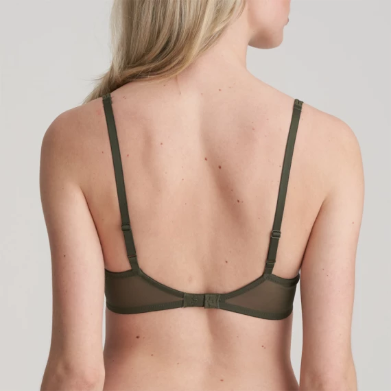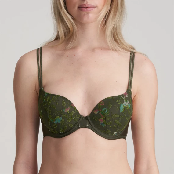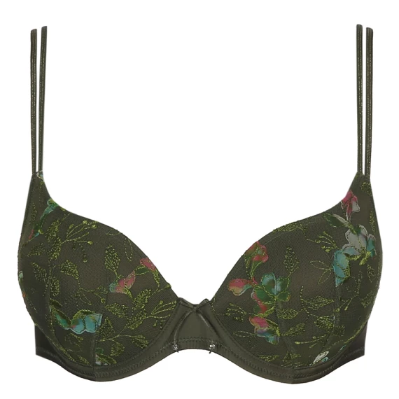 Der herzförmige BH Joanna von Marie Jo ist in der Farbe Forest erhältlich. Dieser grüne BH verführt mit seinem überraschenden floralen Design und seiner schönen Passform. Da die Körbchen oben etwas abfallen, ist dieses Modell für fast jeden Brusttyp geeignet, auch für den weniger vollen Busen. Raffinierte Details wie der Goldfaden in den Trägern und die Schleife zwischen den Cups machen diesen BH komplett! Forest ist ein modischer Khaki-Farbton mit zartem floralem Muster.
