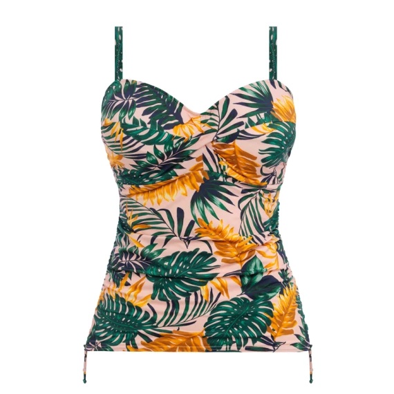 Das Jungle Falls Tankinitop von Fantasie Bademode wird in der Farbe Multi ausgeführt. Dieses Tankinitop hat einen tropischen Print auf einem hellrosa Hintergrund. Das trendige Oberteil hat eine optimale Passform und verleiht den Busen die nötige Unterstützung. Das Tankinitop ist außerdem aus einem feinen Stretch-Stoff gefertigt, der es sehr bequem macht. An den Seiten befinden sich Kordelzüge, so dass Sie das Oberteil höher auf die Hüften fallen lassen können. Kombinieren Sie das Oberteil mit einem der Jungle Falls Bikini Hosen für einen perfekten Strandlook.