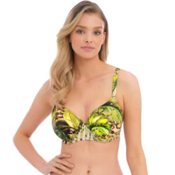Das Kabini Oasis Full Cup Bikini Top von Fantasie Bademode ist in der Farbe Multi erhältlich. Dieses Bikini Oberteil kombiniert zwei auffällige Prints. Ein trendiger Leopardenprint wird mit tropischen Blättern kombiniert. Dieses trendige Oberteil bedeckt den Busen vollständig und zentriert ihn schön. Kombinieren Sie das Oberteil mit einem der Kabini Oasis Bikini Hosen.