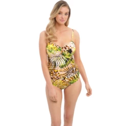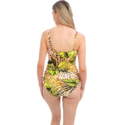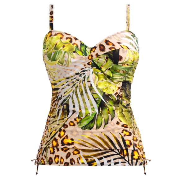 Das Kabini Oasis Tankinitop von Fantasie Bademode ist in der Farbe Multi erhältlich. Dieses Tankini-Oberteil kombiniert zwei auffällige Prints. Ein trendiger Leopardenprint wird mit tropischen Blättern kombiniert. Das coole Top hat eine gute Passform und gibt dem Busen die nötige Unterstützung, außerdem ist das Top aus einem feinen Stretch-Stoff gefertigt, was es sehr bequem macht. An den Seiten befinden sich Kordelzüge, damit Sie das Oberteil höher auf Ihre Hüften fallen lassen können.