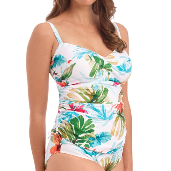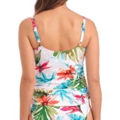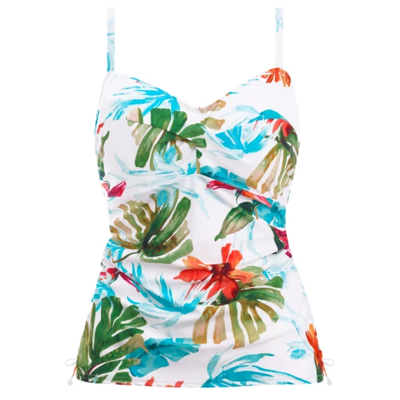 Das Kiawah Island Tankinitop von Fantasie BAdemode hat die Farbe Aquamarin erhältlich. Die Kiawah Island Kollektion ist eine wahre Farbexplosion. Das Tankinitop ist mit einem farbenfrohen Print aus tropischen Blumen versehen und ein echter Hingucker am Strand. Das Tankinitop hat einen unsichtbaren Bügel, der den Busen stützt. Die verstellbare Schleife an den Seiten bietet einen gerafften Effekt, der dem Bauchbereich schmeichelt und die Körpergröße variiert. Kombinieren Sie das Tankinitop mit einem Kiawah Island Bikiniunterteil für einen kompletten Look.
