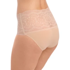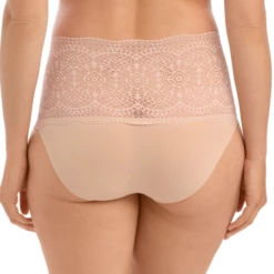 Der Lace Ease Slip von Fantasie ist in der Farbe Natural Beige erhältlich. Dieser beigefarbene Slip sitzt schön hoch auf der Taille, was ideal ist, um einen möglichen Bauch zu kaschieren. Der Slip hat eine elegante Spitze am oberen Rand. Dieser Slip ist in einer Einheitsgröße erhältlich und wird Ihnen gut passen, wenn Sie die Kleidergrößen S bis XL tragen. Der Slip kann mit jedem beliebigen BH kombiniert werden. Ein perfektes Basic für Ihre Dessous-Schublade!