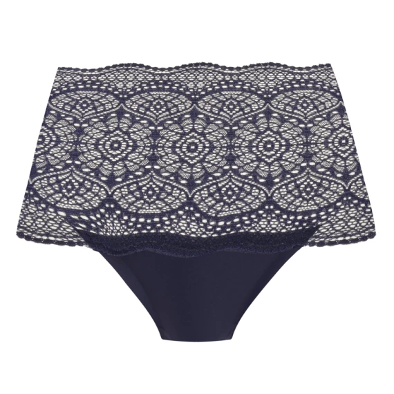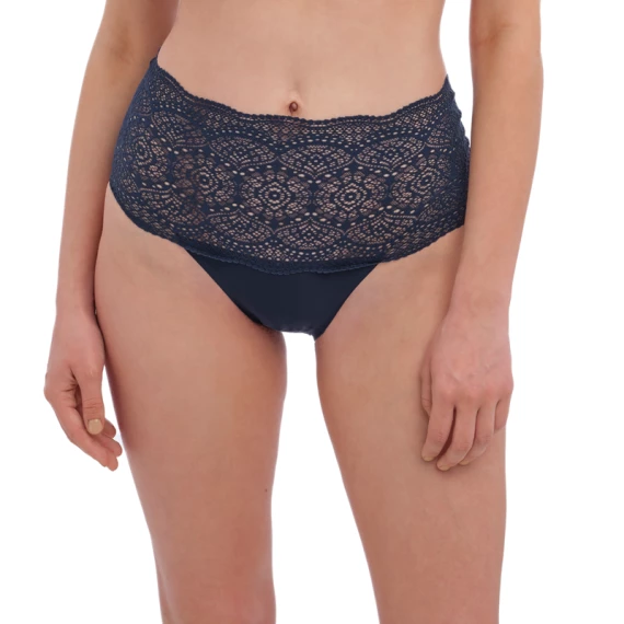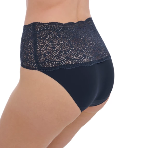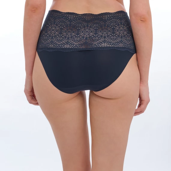 Der Lace Ease Slip von Fantasie ist in der Farbe Navy erhältlich. Dieser blaue Slip sitzt schön hoch in der Taille, was ideal ist, um einen möglichen Bauch zu kaschieren. Der Slip hat eine elegante Stickerei am oberen Rand. Dieser Slip ist in Einheitsgröße erhältlich und passt Ihnen gut, wenn Sie Kleidergröße S bis XL tragen. Der Slip kann mit jedem beliebigen BH kombiniert werden. Das perfekte Basic für Ihre Dessous-Schublade!