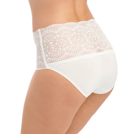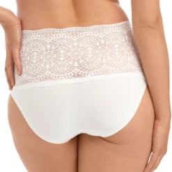Der Lace Ease Slip von Fantasie ist in der Farbe Ivory erhältlich. Dieser ivoryfarene Slip sitzt schön hoch auf der Taille, was ideal ist, um einen möglichen Bauch zu kaschieren. Der Slip hat eine elegante Spitze am oberen Rand. Dieser Slip ist in einer Einheitsgröße erhältlich und wird Ihnen gut passen, wenn Sie die Kleidergrößen S bis XL tragen. Der Slip kann mit jedem beliebigen BH kombiniert werden. Ein perfektes Basic für Ihre Dessous-Schublade!