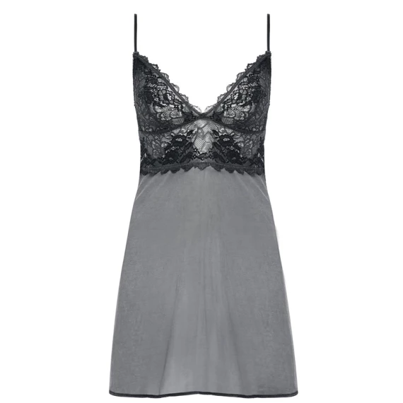 Das Lace Perfection Babydoll-Unterkleid von Wacoal in der Farbe Charcoal. Das Oberteil des Kleides ist mit zauberhafter Spitze verziert. Das Unterteil besteht aus einem leicht durchscheinenden Stoff.