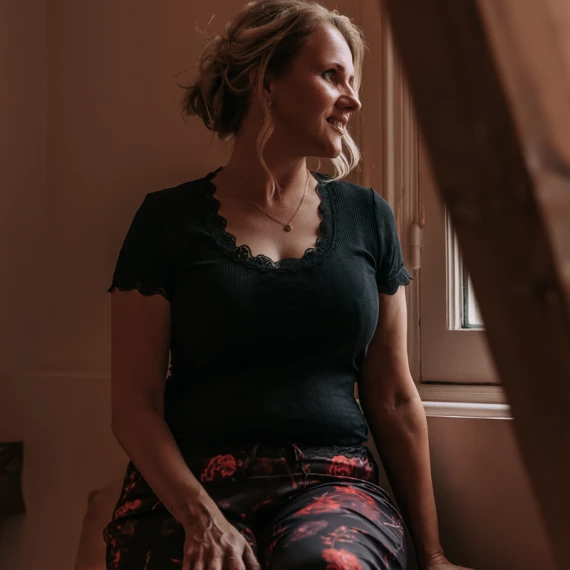 Das Lacy Black Pyjama Shirt von Annadiva Nachtwäsche ist in der Farbe Black erhältlich. Dieses schwarze Shirt ist aus einem weichen Stoff gefertigt, der es sehr bequem macht. Diese Basic-Farbe hat dank des feinen Rippstoffs und der hübschen Spitze an den Ärmeln das gewisse Extra. Der Halsausschnitt ist ebenfalls mit halbtransparenter Spitze verziert. Perfekt zu tragen, sowohl im Winter als auch im Sommer!