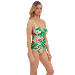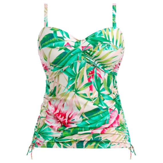 Das Langkawi Tankinitop von Fantasie Bademode ist in der Farbe Sobert gehalten. Dieses Tankintop hat einen Print aus verschiedenen tropischen Blättern. Die Farben Waldgrün und Aquagrün erstrecken sich über einen weichen Hintergrund. Dieses trendige Top hat eine gute Passform und bietet den Busen die nötige Unterstützung. Das Top ist außerdem aus einem feinen Stretch Stoff gefertigt, wodurch es sehr angenehm zu tragen ist. An den Seiten befinden sich Kordelzüge, so dass das Top höher auf die Hüften fallen kann.