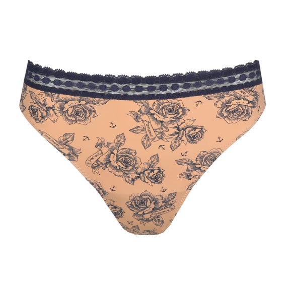 Der Matama String von PrimaDonna Twist ist in der Farbe Light Tan erhältlich. Dieser hautfarbene String hat einen Tattoo-Print aus Rosen und Ankern. Das französische Wort „L’amour“ steht zwischen den Prints und verleiht ihnen eine romantische Note. Die Schnur ist am oberen Ende mit einem Streifen Spitze verziert. Der String bedeckt kaum das Gesäß, so dass man ihn gut unter engen Hosen tragen kann. Kombinieren Sie diesen String mit einem der Matama BHs für einen kompletten Look.