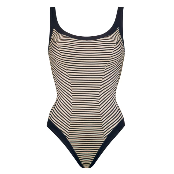 Der Piraten Badeanzug von Maryan Mehlhorn ist in der Farbe Black Desert Gold erhältlich. Der Badeanzug hat einen schwarz-weiß gestreiften Print kombiniert mit Gold. An der Seite wechseln die Streifen die Richtung, betonen die Taille und lassen sie schmaler erscheinen. Kombinieren Sie diesen Badeanzug mit einem schönen Kaftan oder Pareo für einen kompletten Strandlook.