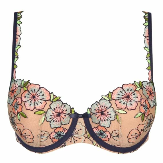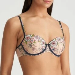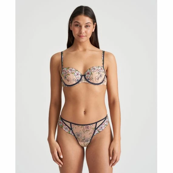 Der Balconette BH Raia von Marie Jo Dessous ist in der Farbe Autumn Leaf erhältlich. Dieser niedliche BH ist mit einer farbenfrohen Blumenstickerei auf einem nackten Hintergrund verziert. Die dunkelblauen Linien bilden einen schönen Kontrast. Die florale Stickerei setzt sich über die Schulterträger fort. Der BH verleiht den Busen einen natürlichen Auftrieb und die vorgeformten Körbchen verleihen dem Busen eine schöne runde Form. Kombinieren Sie diesen BH mit einem der Raia Slips für einen kompletten Look!