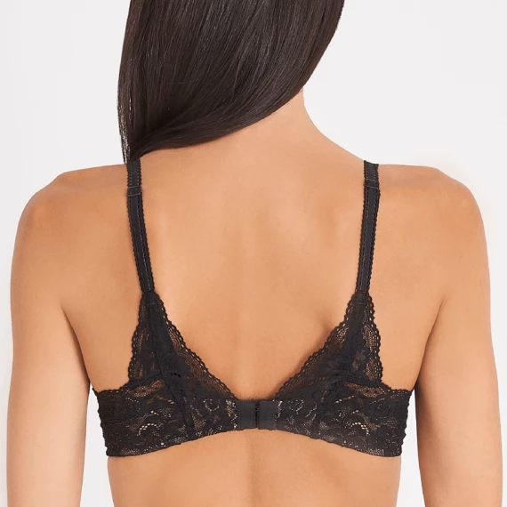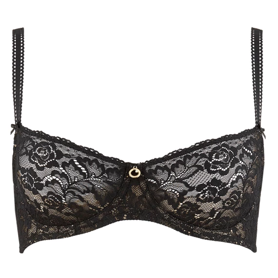 Der Rosessence Balconette Bh von Aubade in der Farbe Noir. Dieser sexy BH ist vollständig überzogen mit schwarzer Spitze. Zwischen den Körbchen ist ein Swarowsky Detail befestigt. Die Ränder der Körbchen und der untere Teil der Träger sind mit elastischer Spitze verziert. Die vorgeformten Körbchen zentrieren die Brüste.