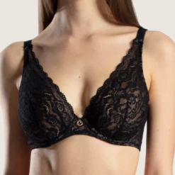 Der Rosessence Komfort Plunge BH von Aubade ist in der Farbe Noir erhältlich. Dieser schöne BH ist komplett mit sexy schwarzer Spitze überzogen. Zwischen den Cups befindet sich ein goldenes Detail. Die Ränder der Cups und der untere Teil der Schulterträger sind mit elastischer Spitze versehen. Kombinieren Sie diesen schönen, bequemen Plunge BH mit einem der Slips aus der Rosessence Kollektion.
