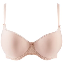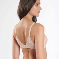 Der Rosessence Spacer BH von Aubade in der Farbe Nude. Dieser hellbeige BH ist unsichtbar unter der Kleidung dank der glatten Spacer Cups. Das Unterbrustband und der Rückensteg sind verziert mit schwarzer, elastischer Spitze.Auf dem Rücken setzt sich die Spitze bis halbhoch auf den Trägern fort so erhält der BH eine verspielte Note.
