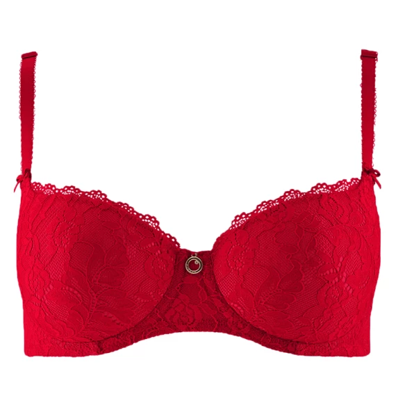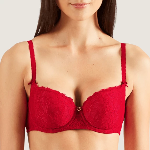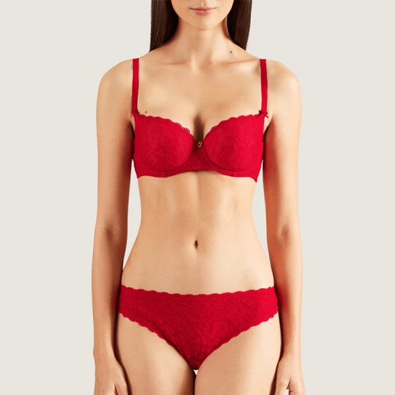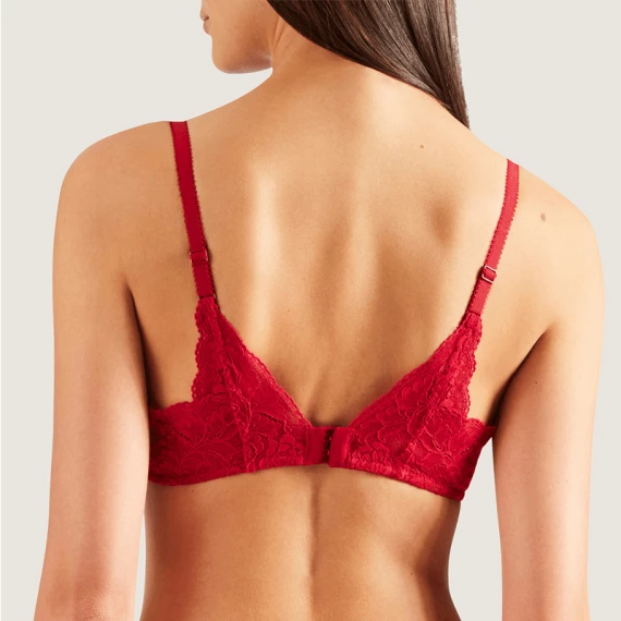 Der Rosessence Vorgeformte BH von Aubade ist in der Farbe Gala erhältlich. Dieser rote BH ist komplett mit sinnlicher roter Spitze überzogen. Zwischen den Körbchen befindet sich ein goldenes Swarovski-Detail. Die Seiten der Körchen und der untere Teil der Träger sind mit elastischer Spitze versehen.
