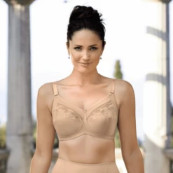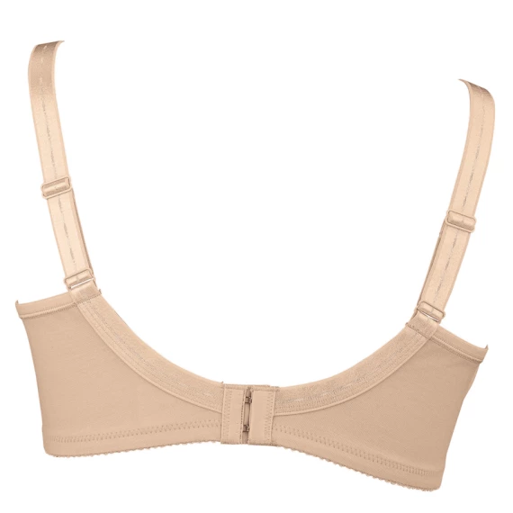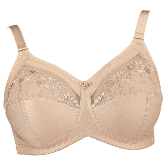 Der Safina Komfort BH von Anita ist in der Farbe Sand erhältlich. Die Körbchen dieses BHs sind aus glattem Material mit durchsichtiger Stickerei. Die dreiteiligen Körbchen, welche aus elastischem Material sind, bieten optimalen Halt und verbessern die Silhouette.