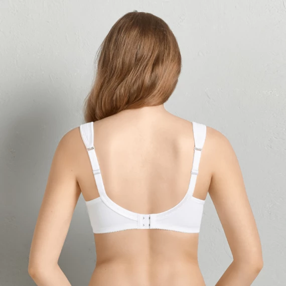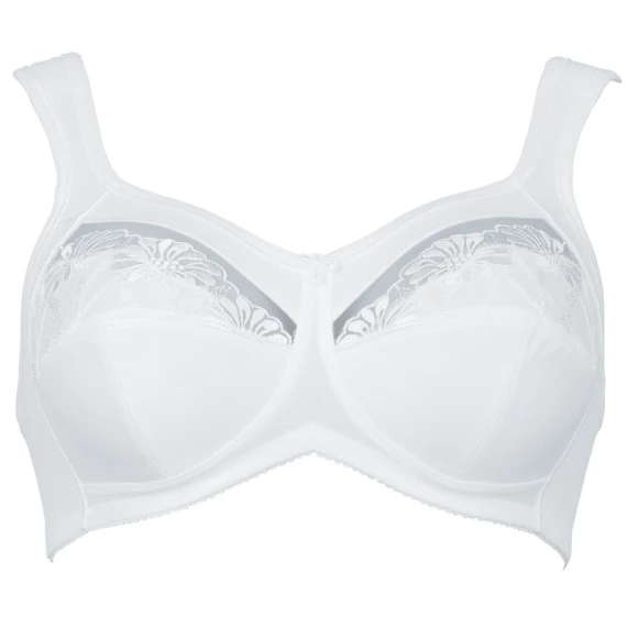 De Safina Komfort/BH von Anita in der Farbe Weiß. Die Körbchen dieses BHs sind aus glattem Material mit durchsichtiger Stickerei. Die dreiteiligen Körbchen, welche aus elastischem Material sind, bieten optimalen Halt und verbessern die Silhouette.