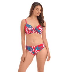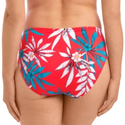 Die Santos Beach Bikini Hose von Fantasie Swim ist in der Farbe Pomegranate erhältlich. Diese hoch geschnittene Bikini Hose hat ein Muster von Palmenblättern und tropischen Blumen auf rotem Hintergrund. Kombinieren Sie mit dem Full-Cup Bikini Oberteil für den perfekten Strand-Look!