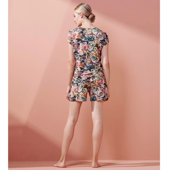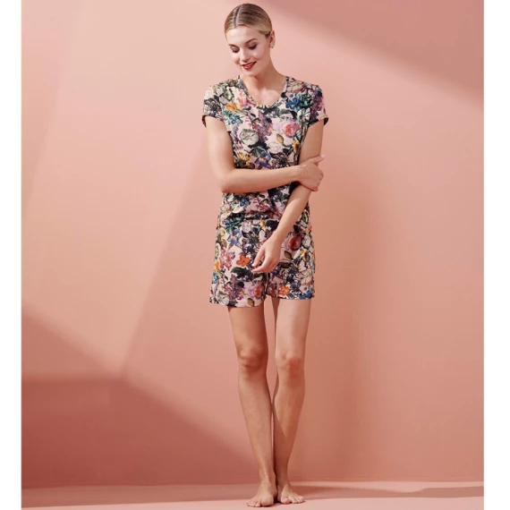 Das Saona Famke Pyjama Shirt von Essenza ist in der Farbe Rose erhältlich. Dieses stilvolle Pyjama Shirt hat einen schönes romantisches Blumen Muster. Die Inspiration für diese eleganten Blumen wurde in den schönen Stillleben der niederländischen Meister gefunden. Das kurzärmelige Oberteil besteht aus EcoVero, einer umweltfreundlichen Alternative zu Viskose, die aus Holz aus erneuerbaren und zertifizierten Wäldern in Europa hergestellt wird. Komfortabel und nachhaltig! Der Stoff ist herrlich leicht, fühlt sich seidig weich an und hat einen leichten Glanz. Verwöhnen Sie sich und Ihre Umgebung mit einem Meer von Blumen!