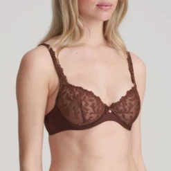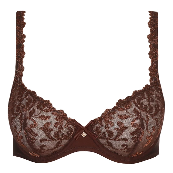 Der Bügel BH Serena von Marie Jo ist in der Farbe Chestnut erhältlich. Dieser braune Bügel BH hat eine Stickerei mit barockem Motiv auf den Cups. Die Cups sind doppelt: Sie sind nicht durchsichtig und besonders fest. Auf diese Weise bieten sie dem volleren Busen ausreichend Halt. Die feinen Broderie-Träger und die elegante Schleife und der Schmuck zwischen den Cups verleihen dem BH eine besonders feminine und elegante Note.