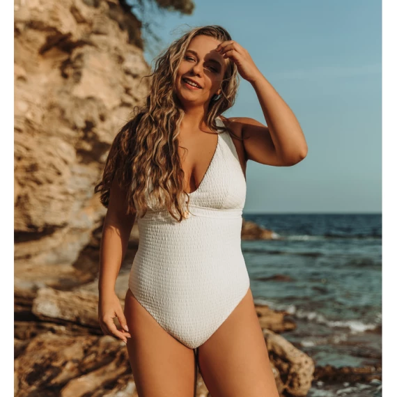 Der Smocky Badeanzug von Annadiva Swim ist in der Farbe Off White erhältlich. Auch in dieser Saison wieder dabei: der fein strukturierte Stoff, der alle Unebenheiten kaschiert. Do we need to say more!? Dies ist der ultimative Favorit von Ihnen und uns. Das plunge Modell schafft ein tiefes Dekolleté und die gepolsterten Cups geben Ihren Busen eine schöne runde Form. Der Badeanzug ist an den Beinen etwas höher geschnitten, so dass er gut sitzt. Kombinieren Sie den Badeanzug mit einem der Annadiva Swim Accessoires. On cloud nine!