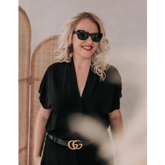 Die Katy Sonnenbrille von Annadiva hat einen edgy Look. Die Brille hat einen schwarzen Rahmen, der seitlich an den Augenbrauen leicht übersteht. Die Gläser sind fast undurchsichtig, so dass die Augen kaum zu sehen sind. Kombinieren Sie es mit Ihrem neuen Bikini oder Strandoutfit! Ideal für den Strand, ein Festival oder einfach nur eine Terrasse.
