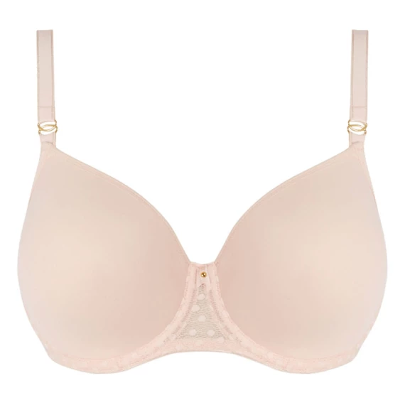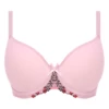 Dieser hellrosa BH hat glatte, nahtlose Cups, so dass der BH perfekt unter enger Kleidung getragen werden kann. Um die Cups herum ist ein Pünktchen Muster und zwischen den Cups sitzt eine kleine, süße Schleife. Da die Bügel zwischen den Cups etwas höher abschließen, bietet der BH optimalen Halt.