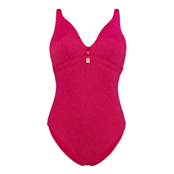 Der Sunset Badeanzug von Annadiva Swim ist in der Farbe Cerise erhältlich. Dieser unwiderstehliche, mit Lurex gemusterte Stoff, bei dem Eleganz und Klasse im Vordergrund stehen, wurde geschaffen, um Sie zum Strahlen zu bringen. Perfekt für sonnige Strandtage, die in unsere Lieblingszeit des Tages übergehen: den Sonnenuntergang. Das plunge Modell schafft ein tiefes Dekolleté und die gepolsterten Cups geben Ihren Busen eine schöne runde Form. Der Badeanzug ist an den Beinen etwas höher geschnitten, für eine perfekte Passform. Kombinieren Sie diesen Badeanzug mit einem der Strand Accessoires von Annadiva Swim. The Sunday of summer!