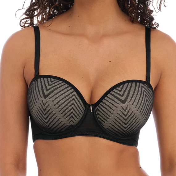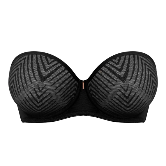 Der Tailored trägerlose BH von Freya ist in der Farbe Schwarz erhältlich. Dieser elegante BH hat einen gestreiften Print. Dank der abnehmbaren Träger kann der BH auf verschiedene Arten getragen werden: trägerlos, gerade, überkreuzt oder als Neckholder. Der BH ist mit einem hübschen rosegoldenen Detail zwischen den Cups versehen. Vervollständigen Sie Ihren Look mit einem der passenden Slips aus der Tailored Kollektion!