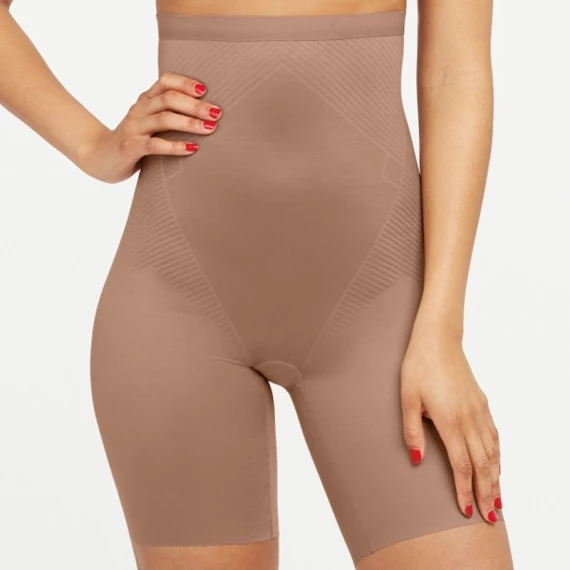 Die Thinstincts 2.0 High Waisted Mid Thigh Shorts von Spanx ist in der Farbe Café au Lait gehalten. Diese sehr bequeme Short hat mehrere Korrekturstreifen auf der Vorderseite, der Seite und dem Rücken. Auf diese Weise fühlen Sie sich nicht völlig eingeengt, aber Ihr Körper wird trotzdem maximal geformt. Im Bereich des Gesäßes gibt es kein korrigierendes Gewebe, so dass das Gesäß seine natürliche runde Form behält.